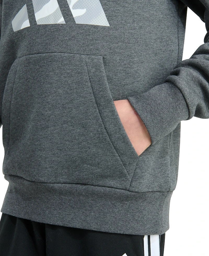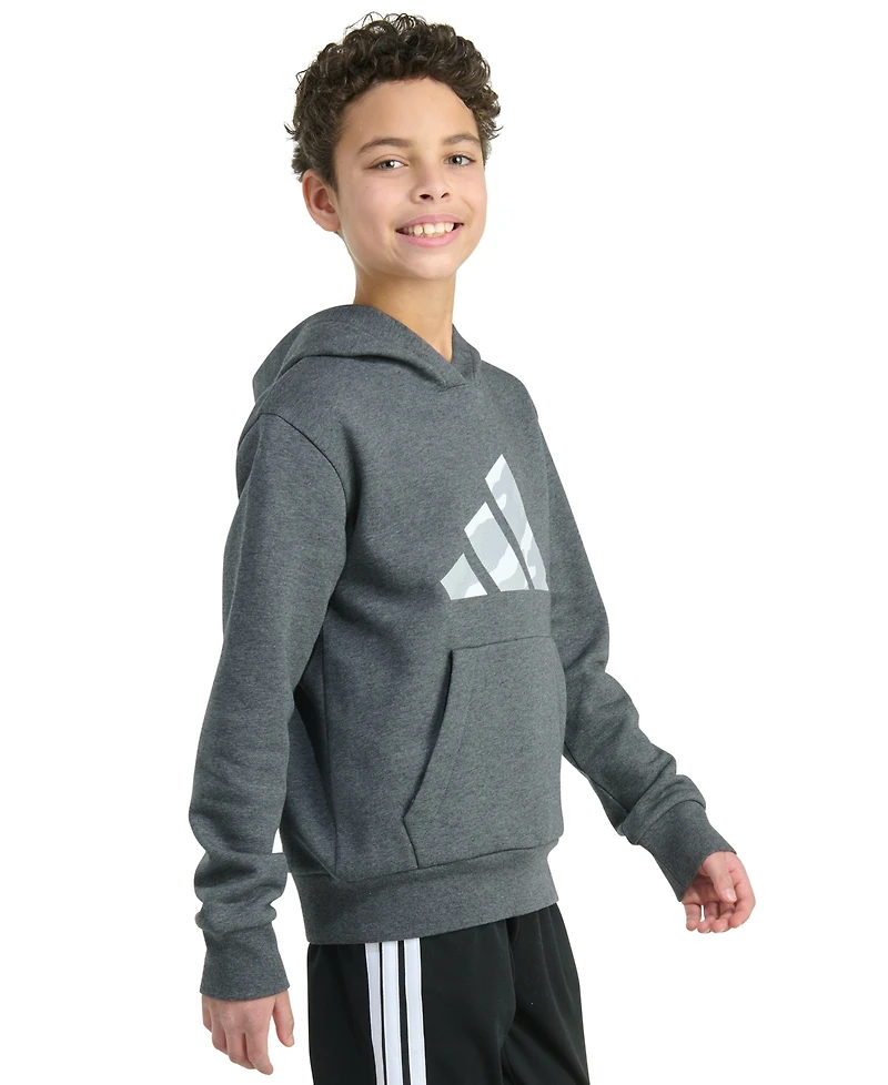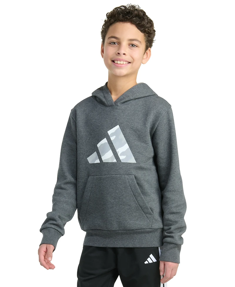 adidas updates essentials with this big boy pullover hoodie. It features soft cotton-blend fleece, a roomy hood, kangaroo pocket for hand warmth, and ribbed cuffs and hem for a secure fit. A camo-filled 3-bar logo adds playful detail, and regular fit ensures comfort and ease of movement.