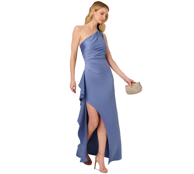 Adrianna Papell Women's One-Shoulder Ruffle-Trim Satin Crepe Gown