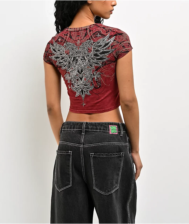 Winged crosses and layered scroll graphics cover the Divine Sorrow dark red crop t-shirt from Affliction in true punk rock fashion. Metallic foil accents catch light across the front and back, amplifying the gothic design. Finished in a washed red to