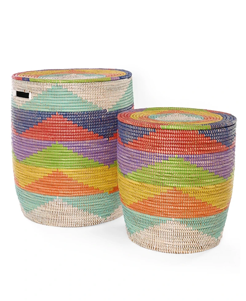 The Rainbow Mountains Flat Lidded Hamper Set is a vibrant, handcrafted pair of nesting storage baskets, woven with a cheerful rainbow herringbone pattern that brings both color and texture into everyday spaces. Each basket is meticulously made by skilled Wolof women artisans in rural Senegal using traditional coiling techniques, with natural cattail stalks bound together with plastic strips to create sturdy, long-lasting forms. Because these baskets are woven by hand, slight variations in size and pattern make every set uniquely beautiful. Ideal for organizing and adding style throughout the home, these flat-lidded hampers are perfect for storing laundry, toys, linens, or household essentials while keeping them out of sight. The larger basket features convenient cut-out handles for easy transport, and both lids help maintain a neat, streamlined look in bedrooms, bathrooms, or living areas. Their cheerful design and functional form make them as decorative as they are practical, bring...