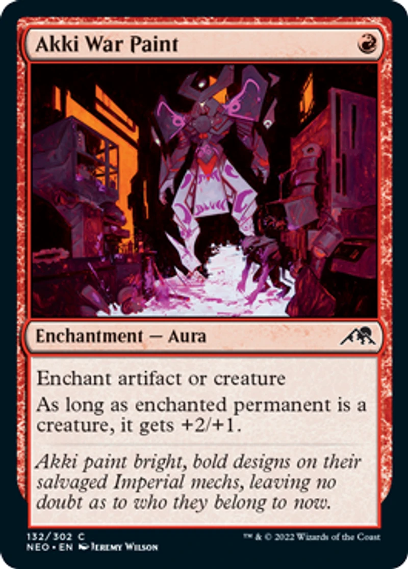 Color: Red Card Text: Enchant artifact or creature As long as enchanted permanent is a creature , it gets +2/+1. Rarity: C Cost: R Card Type: Enchantment - Aura Artist: Jeremy Wilson Name: Akki War Paint Finish: Foil Card Number: 132/302 Set Name: Kamigawa: Neon Dynasty