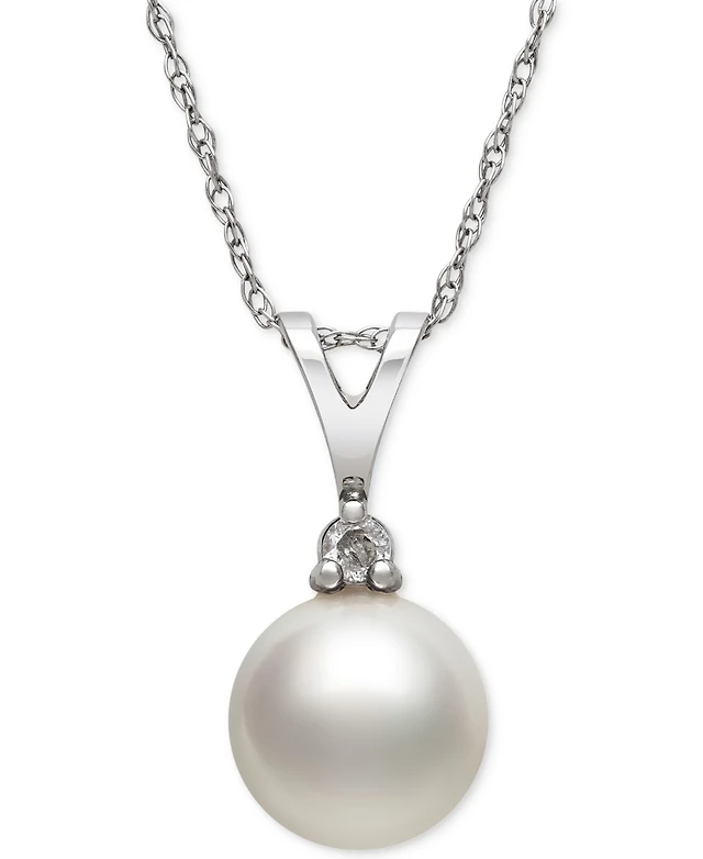 Akoya Pearl (7mm) and Diamond Accent Pendant Necklace in 14k White Gold