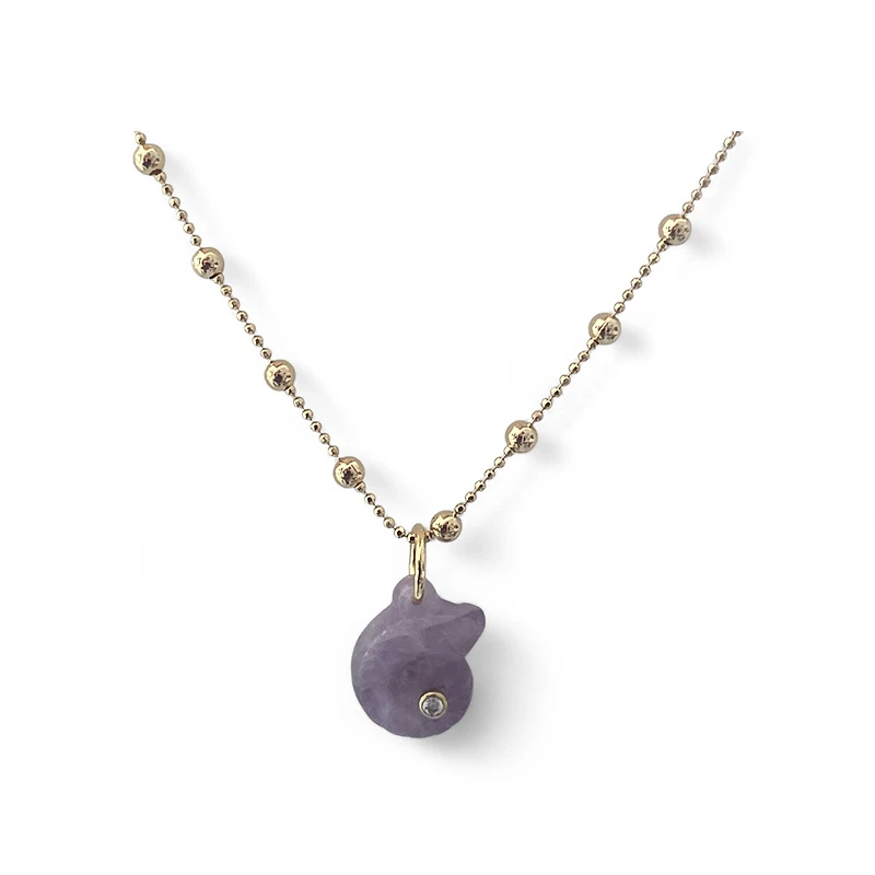 Elegant 16" necklace featuring a lustrous amethyst shell pendant set in 18K Brazilian goldfilled metal. Hypoallergenic construction makes it ideal for sensitive skin. The rich purple hue adds a sophisticated pop of color to any ensemble, while the durable goldfilled chain ensures lasting wear. Perfect for layering or wearing solo as a statement piece.