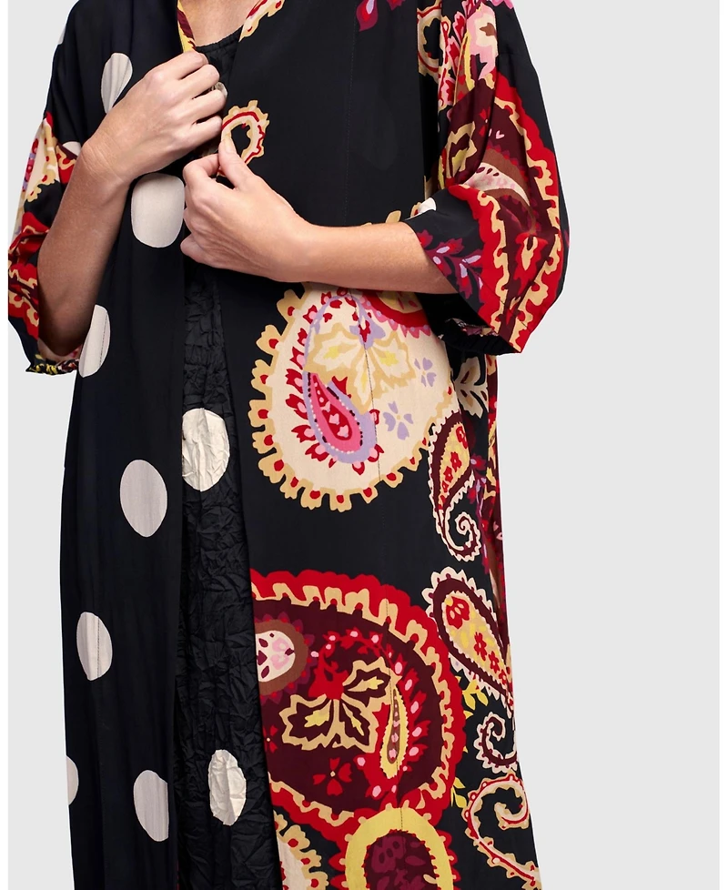 Make this paisley print jacket a bold option for your wardrobe-it's an effortless accent piece with plenty of pizazz. With a relaxed fit and straight silhouette, this lightweight layer has an open front and long slim sleeves.
