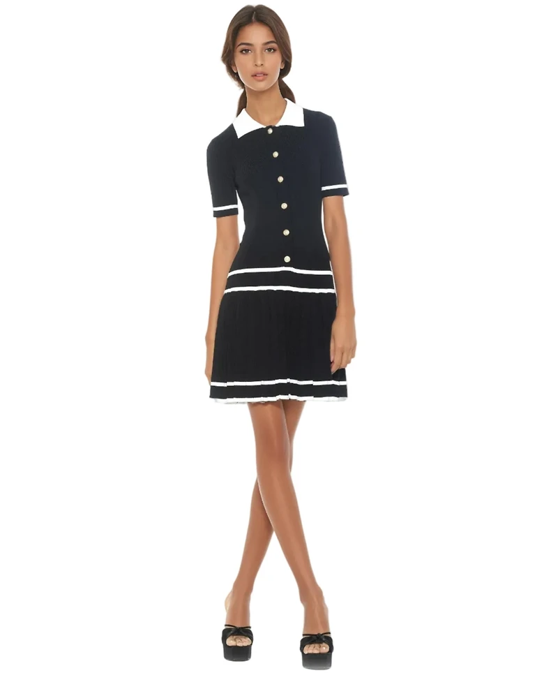 Introducing the Lucinda Fully Knit Collared Short Sleeve Dress: an elegant fusion of classic prep and contemporary refinement. Expertly crafted in a luxe knit with a graceful pleated skirt and dropped waist, this mini dress captures effortless poise from every angle. Elegant pearl buttons and contrast trim accentuate the collared neckline, creating a polished silhouette that feels both timeless and modern.