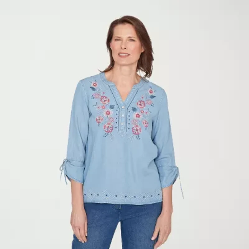 Alfred Dunner Austin Womens Y Neck 3/4 Sleeve Embroidered Blouse