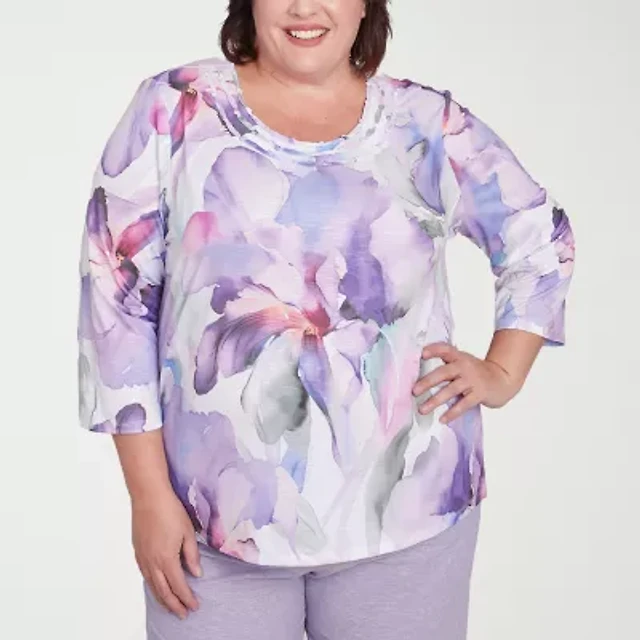 Alfred Dunner Crystal Springs Womens Crew Neck 3/4 Sleeve Plus T-Shirt