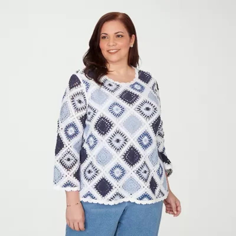 Alfred Dunner Plus Austin Womens Crew Neck 3/4 Sleeve Geometric Pullover Sweater