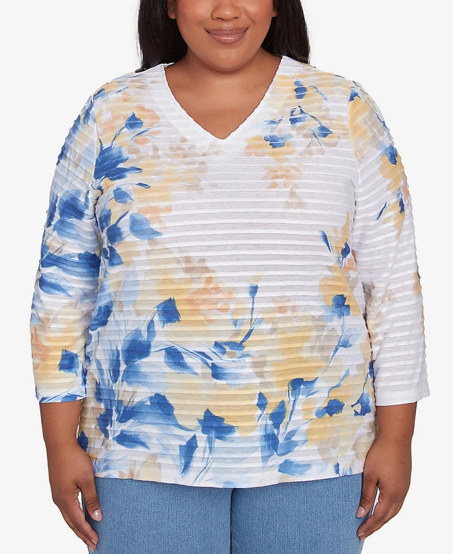 Alfred Dunner Plus Flower Power Floral Textured V Neck Top