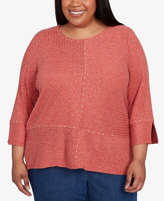 Alfred Dunner Plus Size Sunset Canyon Embellished Spliced Solid Top