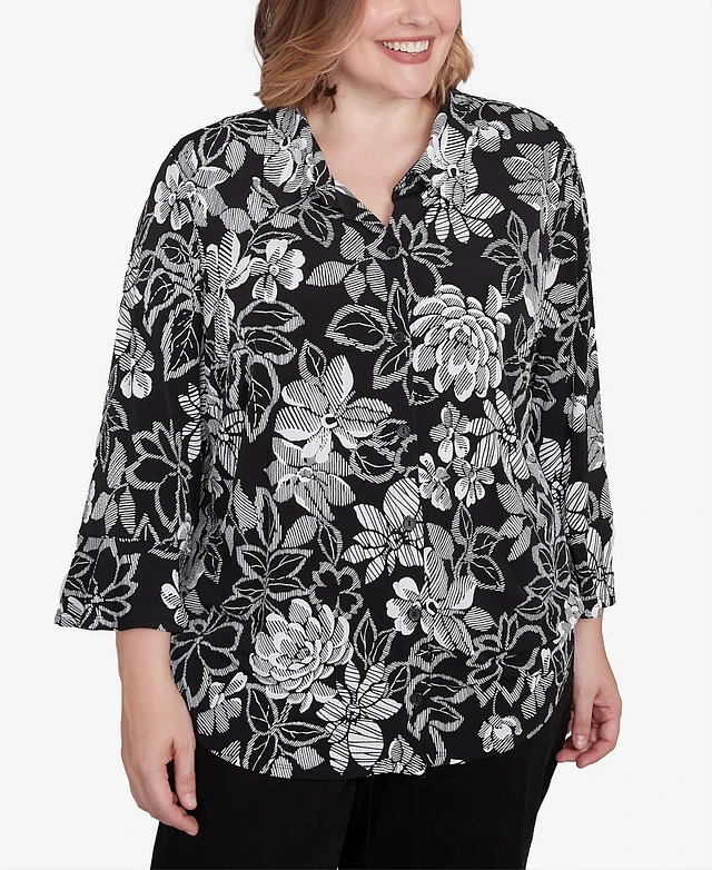 Alfred Dunner Plus Size Wild at Heart Floral Puff Print Button Down Top
