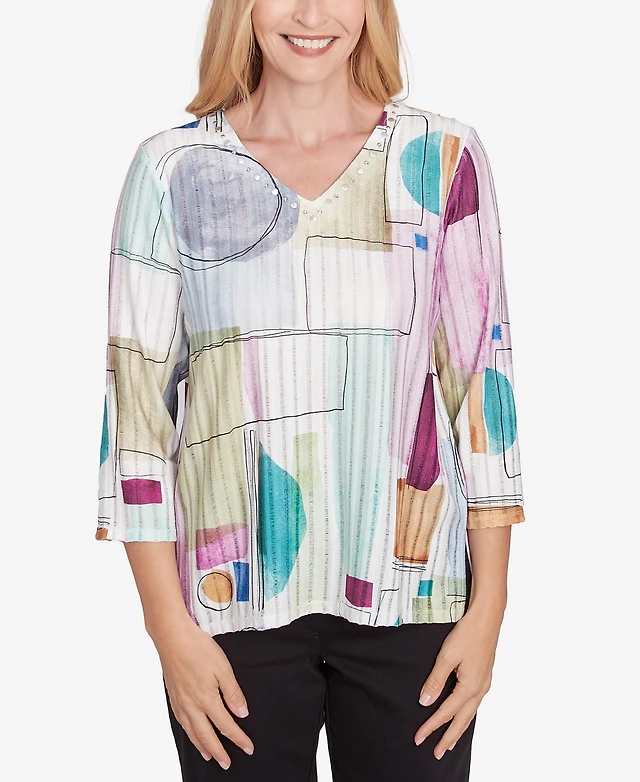 Alfred Dunner Women's Classic Geometric V-Neck Three Quarter Sleeve Top