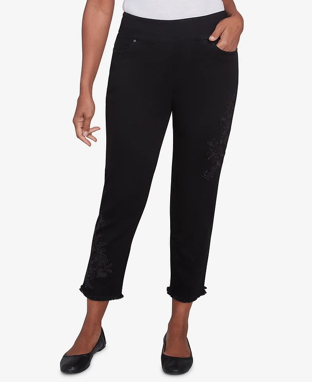 Alfred Dunner Women's Wild at Heart Embroidered Floral Denim Fringe Ankle Pants
