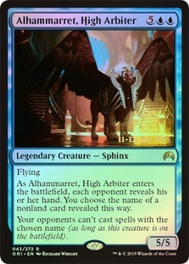 Color: Blue Card Text: Flying As Alhammarret , High Arbiter enters the battlefield each opponent reveals his or her hand. You choose the name of a nonland card revealed this way. Your opponents can't cast spells with the chosen name (as long as this creature is on the battlefield.) Rarity: P Cost: 5UU Pow/Tgh: 5/5 Card Type: Legnedary Creature - Sphnix Artist: Richard Wright Name: Alhammarret High Arbiter Finish: Foil Card Number: 043/272 Set Name: Origins