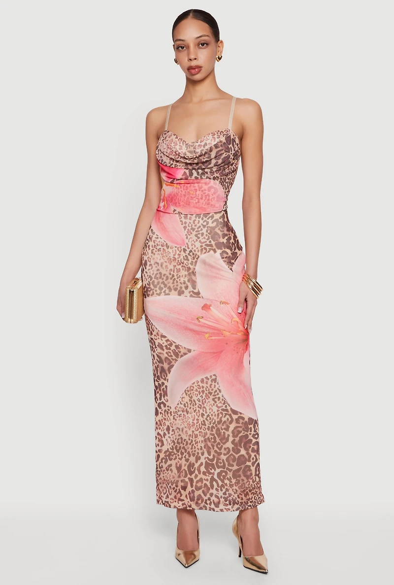 This long-length dress features a cowl neckline and sleeveless design, creating a sleek, curve-hugging silhouette. Crafted from mesh fabric with padded cups and lining, it balances style with structure. Perfect for dressy occasions, it combines floral and animal prints for a bold, modern look.