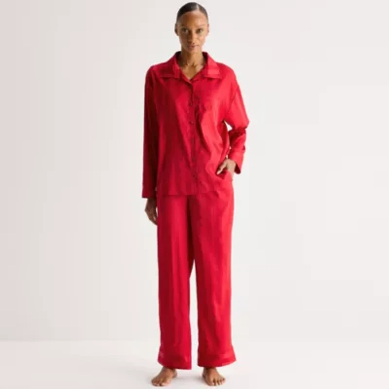Ambrielle Womens Satin Long Sleeve 2-pc. Pajama Sets