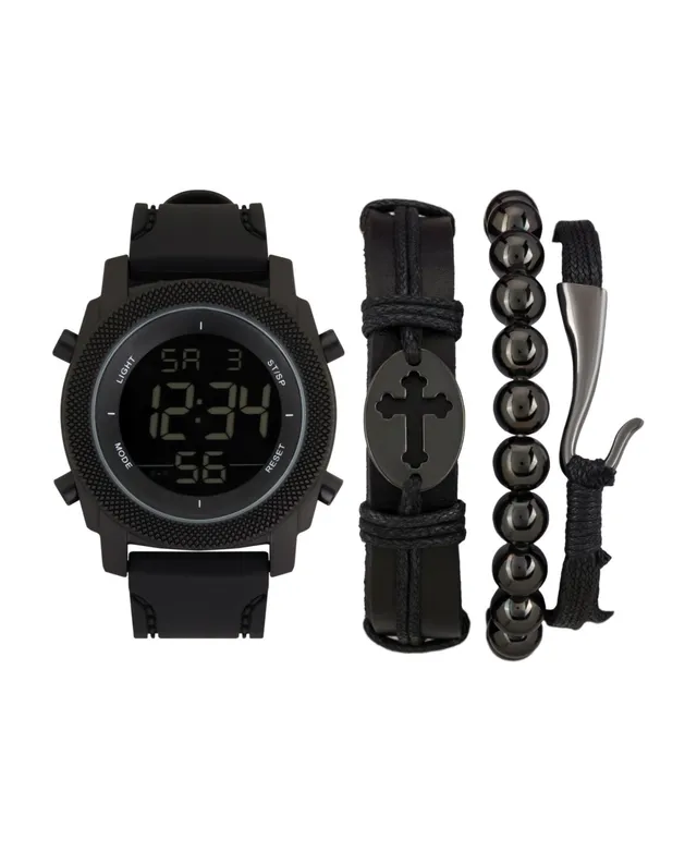 American Exchange Men's Quartz Digital Dial Black Silicone Strap Watch and Assorted Black Stackable Bracelets Gift Set, Set of 4