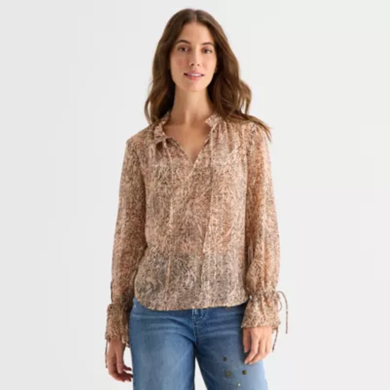 a.n.a Sheer Womens Split Tie Neck Long Sleeve Blouse