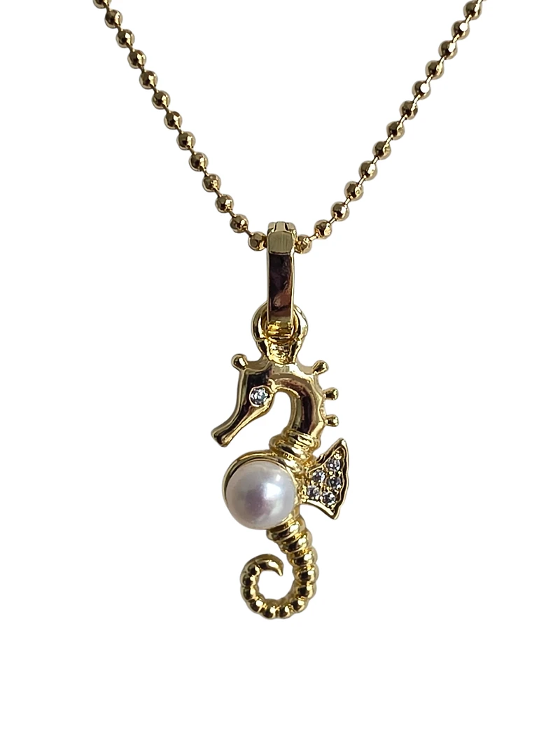 Delicate seahorse charm crafted in 18K Brazilian goldfilled, adorned with a lustrous pearl accent. This hypoallergenic design is perfect for sensitive skin, making it an ideal everyday piece or meaningful gift. The intricate seahorse detail adds a touch of ocean-inspired elegance to any collection. Measures 20 inches in length for a graceful, wearable fit.