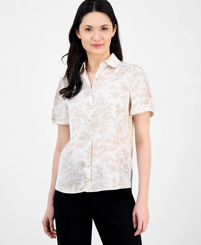 Anne Klein Women's Floral-Print Short-Sleeve Collared Blouse