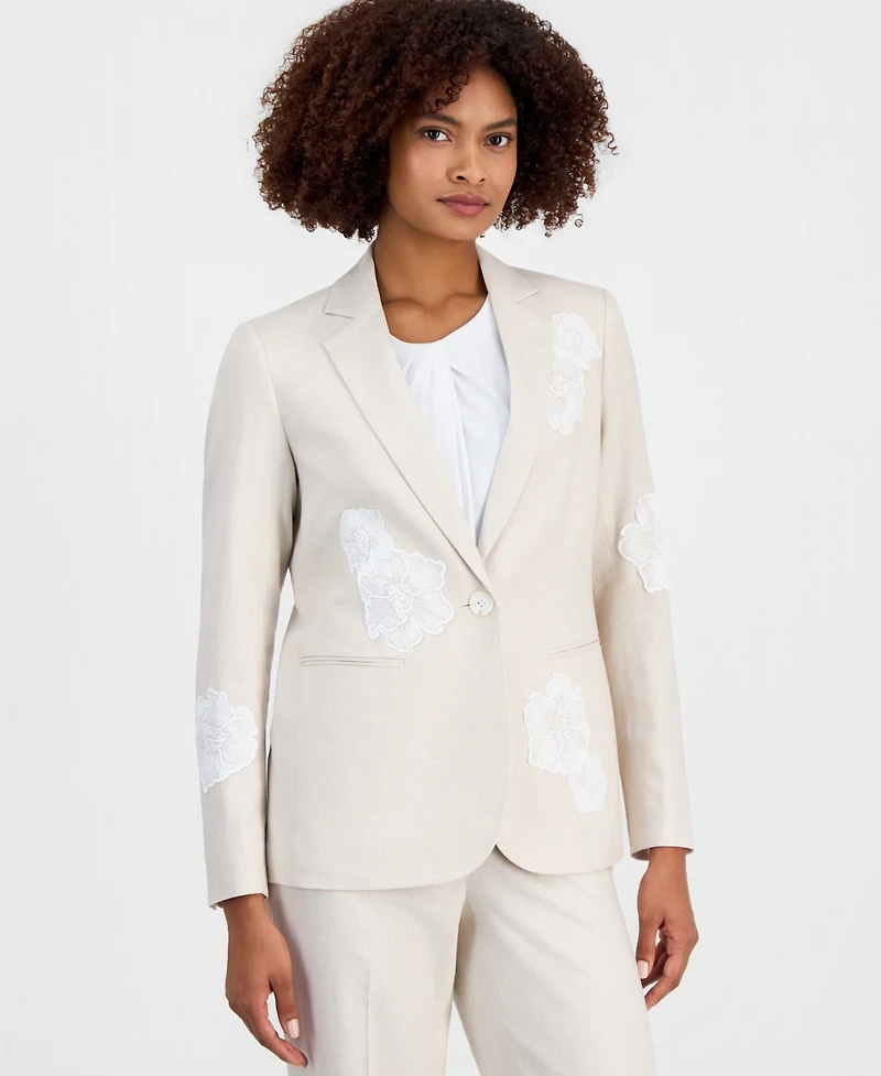 Anne Klein Women's Linen-Blend One-Button Embroidered Blazer