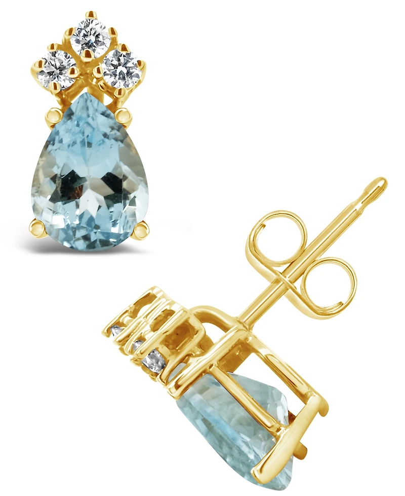 These lovely stud earrings each feature a 7mm x 5mm pear-shaped aquamarine topped with three diamonds. Perfect for any occasion.