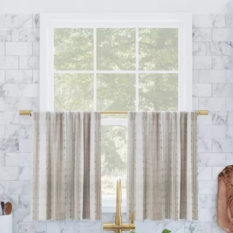 Infuse southwestern chic into any room of your home with the cassidy rod pocket kitchen curtain tier pair from archaeo. Featuring yarn-dyed vertical stripes, this slub textured semi-sheer cotton fabric gently filters light while enhancing privacy. Ideal for kitchens, bathrooms, or small windows, the pole top rod pocket design allows for simple slide-through installation on curtain rods up to 1.5" in diameter.