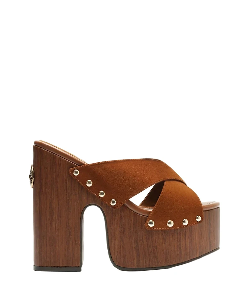 # AREZZO FLORENZA PLATFORMS Crafted in premium suede leather and proudly made in Brazil, this sophisticated sandal combines architectural design with refined comfort. The rounded toe silhouette sits atop a chunky block heel and platform base, while asymmetrical straps with studded accents cross the foot and instep for a modern, editorial aesthetic. The smooth leather insole features the brand signature, and a metallic hardware detail adorns the heel. Perfect for elevating any wardrobe with luxury Brazilian craftsmanship and contemporary style.