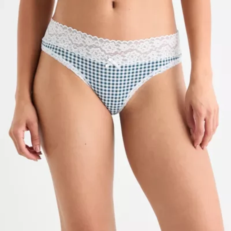 This Arizona Body lace thong panty will be one of your on-trend go-tos to wear under everything. Made from an organic stretch cotton-jersey, these panties have a lace trim and delicate back coverage.