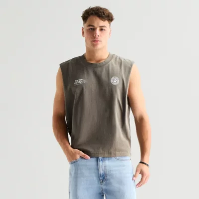 Show off all the work you've been putting in the gym for arm day when wearing this men's sleeveless muscle t-shirt from Arizona Jean Co. Made from soft cotton-jersey, it features a graphic design on the front and back and a classic crew neckline. Wear it with everything from denim shorts to cargo pants.
