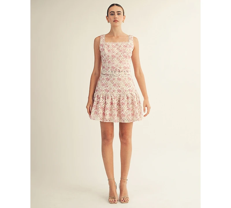 Incorporating a belted waist and ruffle hem, this Arose Studio, Inc mini dress features a square neckline and sleeveless design. Floral lace detailing adds a romantic, feminine touch.