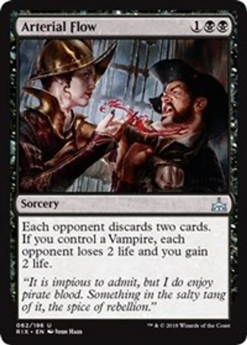 Color: Black Card Text: Each opponent discards two cards. If you control a Vampire , each opponent loses 2 life and you gain 2 life. Rarity: U Cost: 1BB Card Type: Sorcery Artist: Josh Hass Name: Arterial Flow Finish: Regular Card Number: 062/196 Set Name: Rivals of Ixalan