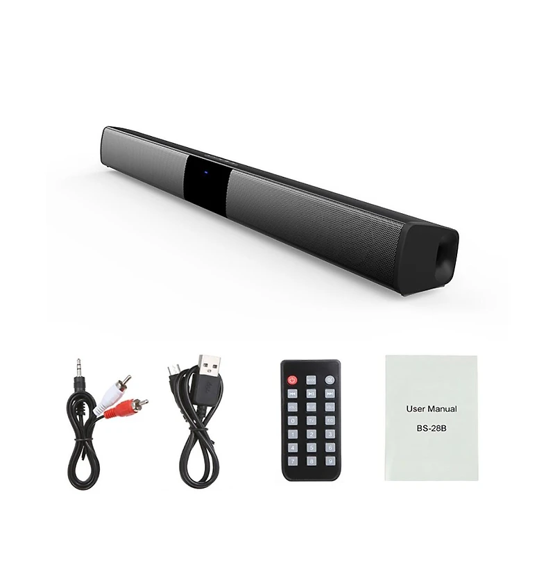 This surround sound soundbar features four 5W full-range speaker units, paired with a wireless Bluetooth subwoofer and remote control, creating a 2.0-channel home theater solution with a 360° surround sound field. The device integrates Fm radio functionality and various connectivity options, supporting Bluetooth 5.0, Tf card, Aux, and Rca wired input, making it widely compatible with TVs, computers, mobile phones, and other multimedia devices. The built-in 2000mAh battery provides approximately 5 hours of continuous playback, and its compact and portable design caters to both indoor and outdoor use. The package includes the speaker unit, remote control, charging cable, and audio cable, offering users an immersive listening experience that integrates radio reception, playback, and amplification.