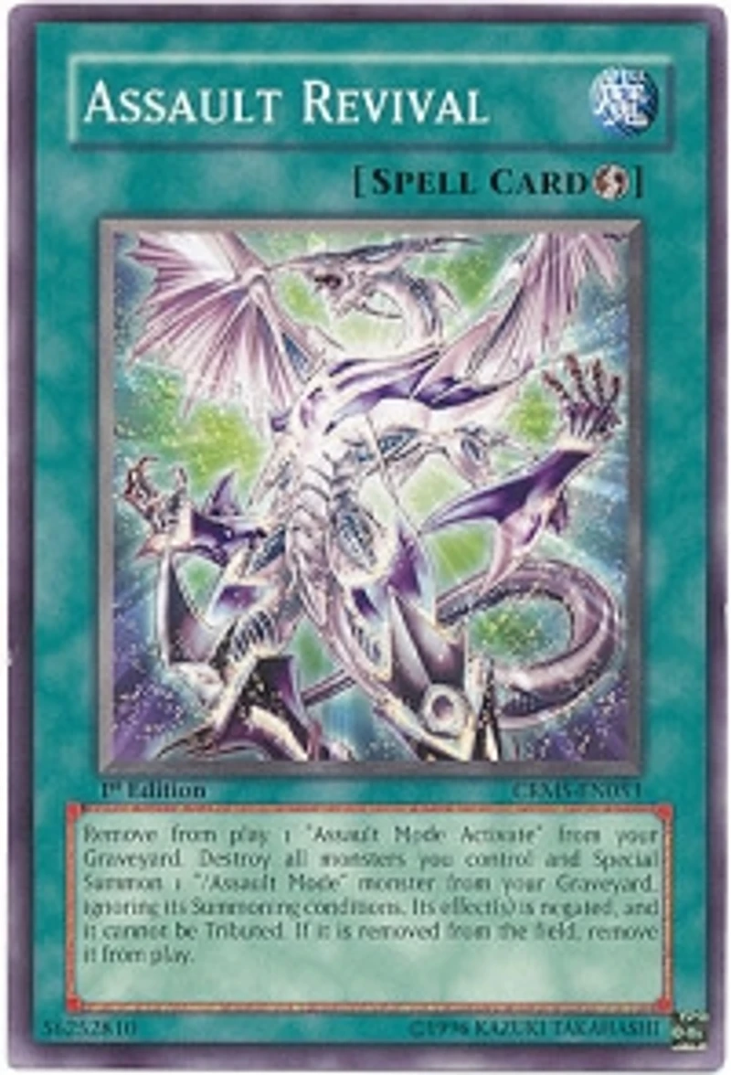 Card Rules: No rulings available for this card. Passcode: 56252810 Set: Crimson Crisis Card Number: CRMS-EN053 Rarity: Common Attribute: Spell Card Text: Remove from play 1 'Assault Mode Activate' from your Graveyard. Destroy all monsters you control and Special Summon 1 '/Assault Mode' monster from your Graveyard , ignoring its Summoning Conditions. Its effect9s) is negated and it cannot be Tributed. If it is removed from the field remove it from play. Card Type: Quick-Play Spell Name: Assault Revival Edition: Unlimited