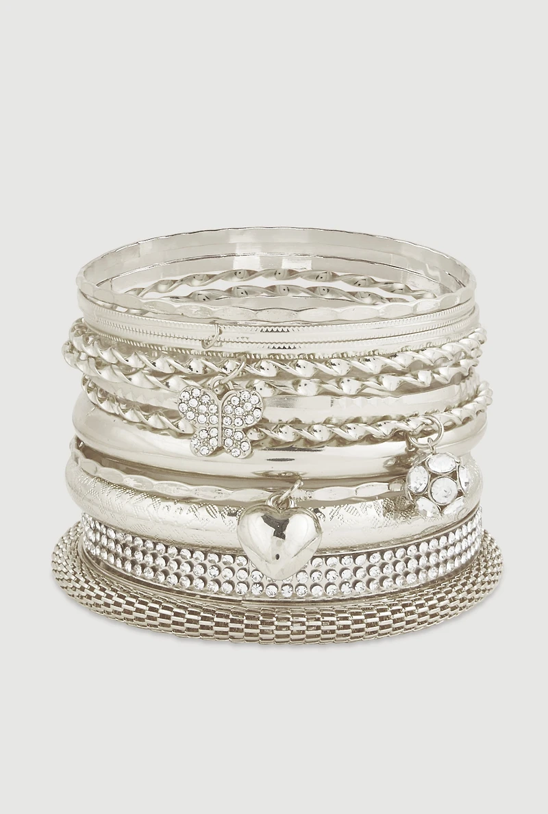 A set of 12 metallic bangles featuring assorted charm embellishments adds effortless flair to any casual outfit. These versatile bracelets layer easily for a personalized look that transitions from day to night.