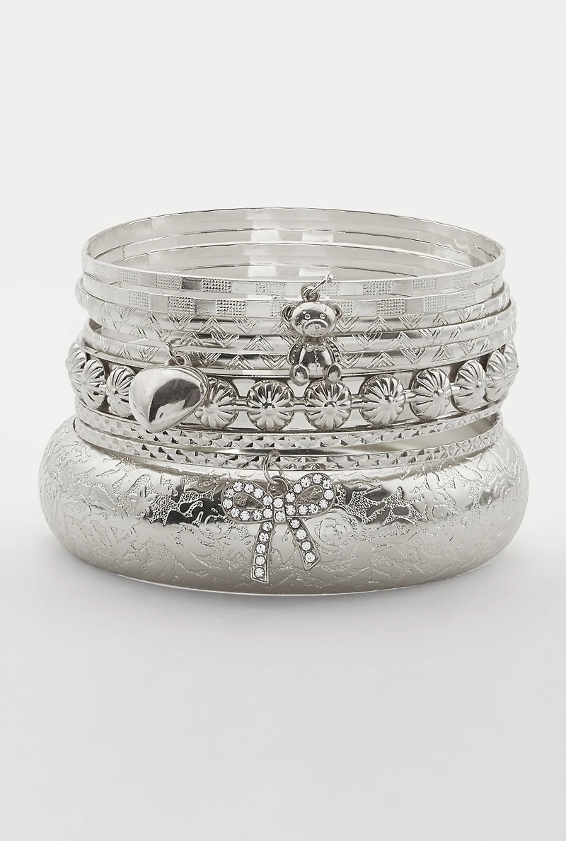 Assorted Metallic Rhinestone Bow Charm Bangles Set of 9