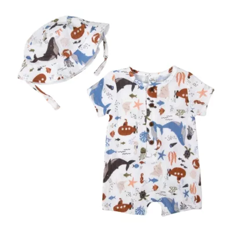 This Baby Essentials 2-piece romper set for baby boys makes an adorable addition to his clothing collection. Made from 100% cotton, this short-sleeve romper has a cute painterly boat print, button-front closures and snap-bottom closures. The set comes complete with a matching bucket hat with a fastening strap.