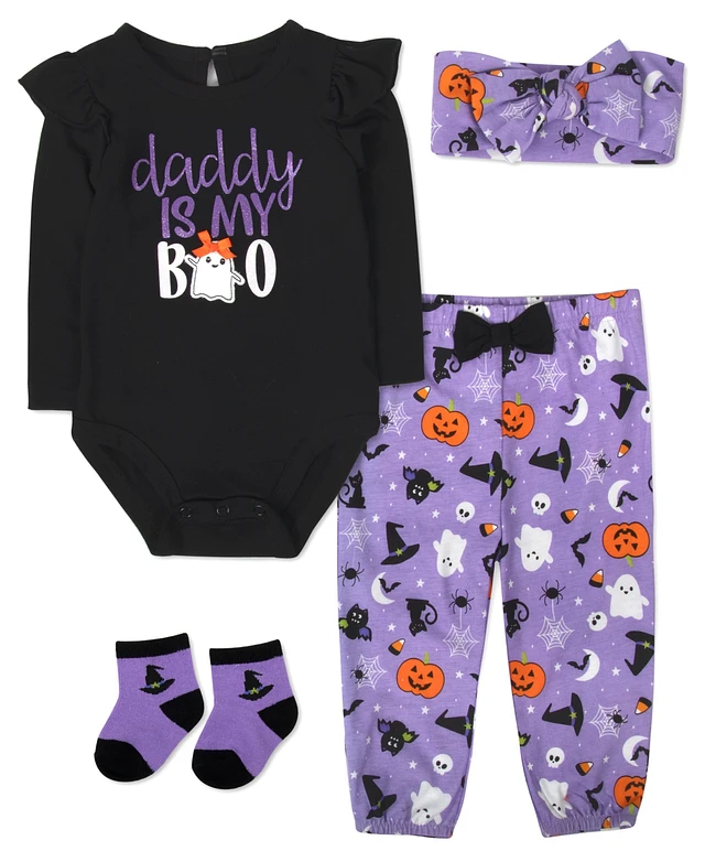 Baby Essentials Girl Halloween Bodysuit, Pant, Sock & Headband, 4-Piece Set