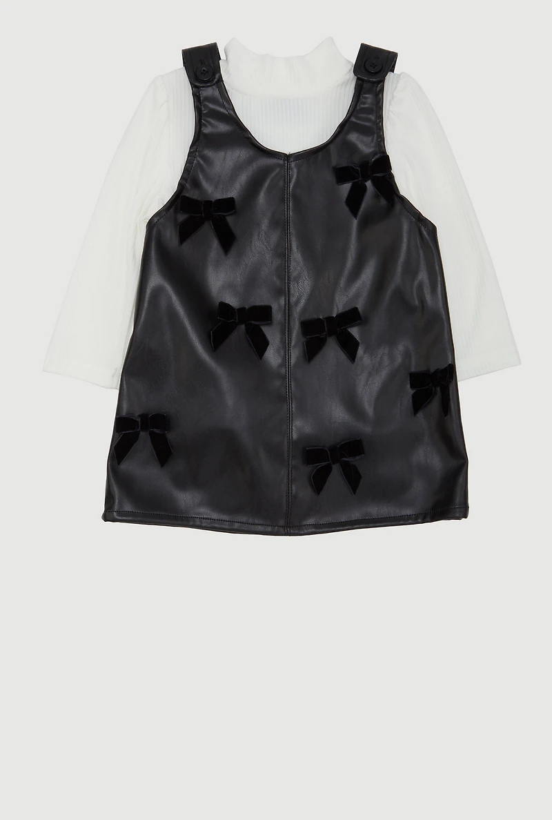Includes a faux leather overall dress and a soft ribbed knit T-shirt