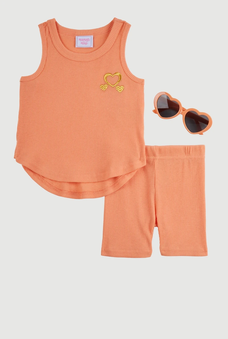 This 3-piece set for baby girls includes a sleeveless tank top and biker shorts, designed for easy layering and all-day play. The ribbed knit fabric offers gentle stretch and softness, while the embroidered heart detail adds a sweet touch. Sunglasses complete the set for sunny day adventures.
