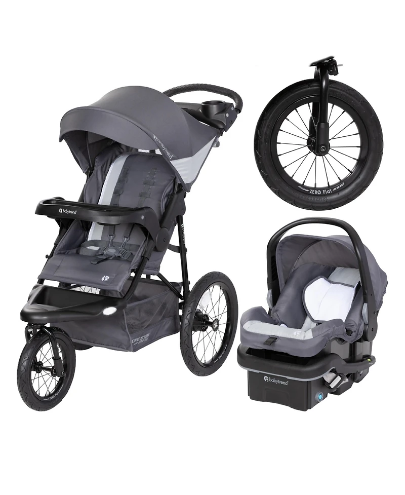 The Baby Trend Expedition Zero Flat Jogger Travel System with Led Lights is designed with style and security for you and your child. The innovative Zero Flat Tires will never go flat, allowing the tires to stay inflated for the life of your jogger. For added safety, the Led lights installed on parent tray illuminate stroller during walks at sundown. It has a parent tray with 2 cup holders and covered storage compartment and an extra-wide ergonomically shaped rubber grip for comfortable handling. The jogger also includes a 5-point harness and a rotating canopy with visor that can be adjusted to shield your child from the elements. It has a convenient storage basket under the seat, offering ample space to carry feeding bottles or other baby essentials. Its front wheel swivels for easy maneuvering. The wheel can also be locked to offer in-line performance. This travel system includes the all-new Ez-Lift Infant Car Seat with the integrated Side Grip handle for ergonomic carrying.