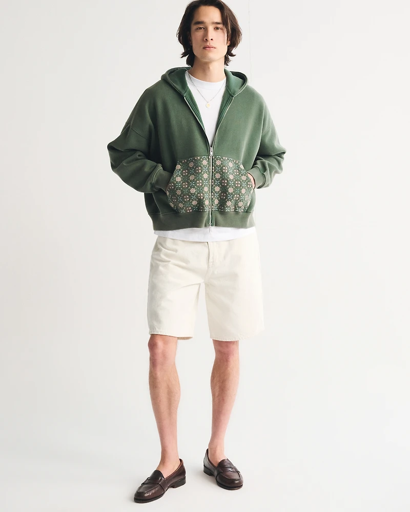 Our 10 inch (25 cm) denim shorts in a baggy, relaxed fit and our 100% cotton authentic rigid denim fabric. Features a light wash, embroidered graphic details throughout and clean hem.