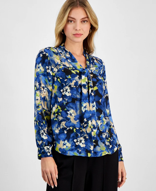 Bar Iii Women's Floral-Print Tie-Neck Blouse, Exclusively at Macy's