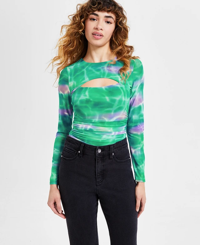 Bar Iii Women's Printed Long-Sleeve Ruched Mesh Top, Exclusively at Macy's