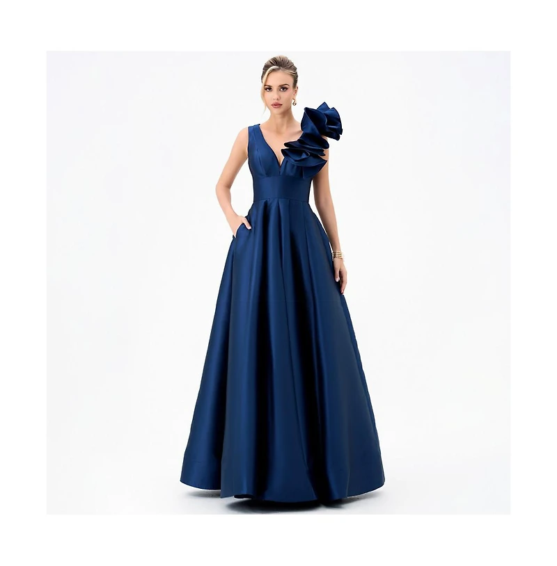 Defined by a plunging V neckline, this gown makes a statement with a sculptural ruffle detail at one shoulder. The fitted bodice is structured with a wide waistband and built-in bust cups for support, before falling into a sweeping A-line skirt with discreet in-seam pockets. Fully lined and finished with an invisible zip closure at the back.