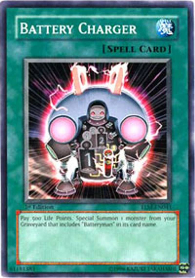 Card Rules: Rulings powered by The Netrep Passcode: 61181383 Set: The Lost Millenium Card Number: TLM-EN041 Rarity: Common Attribute: Spell Card Text: Pay 500 Life Points. Special Summon 1 monster from your Graveyard that includes 'Batteryman' in its card name. Card Type: Normal Spell Name: Battery Charger Edition: Unlimited