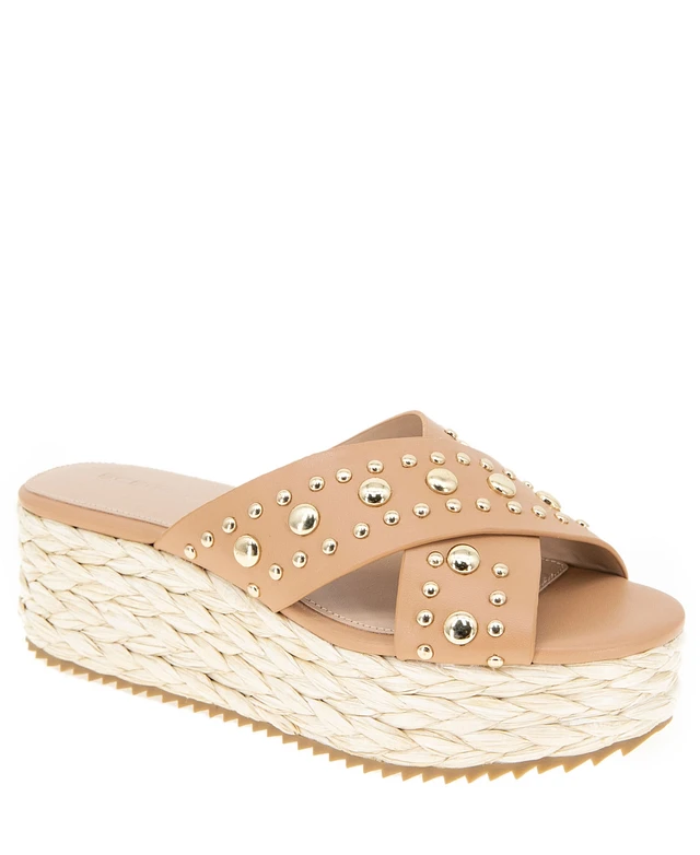 BCBGeneration Women's Gladda Studded Flatform Raffia Slip-On Crossband Wedge Sandals