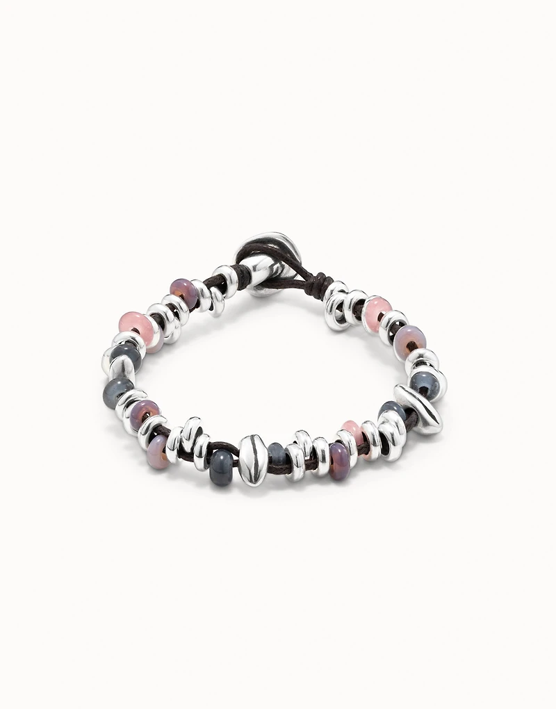 Bracelet designed in leather with silver-plated pieces of different sizes inspired by wheat grains and handmade crystals dyed in a natural way. A creation of casual style elaborated under a handcrafted process. 100% made in Spain and original UNOde50.