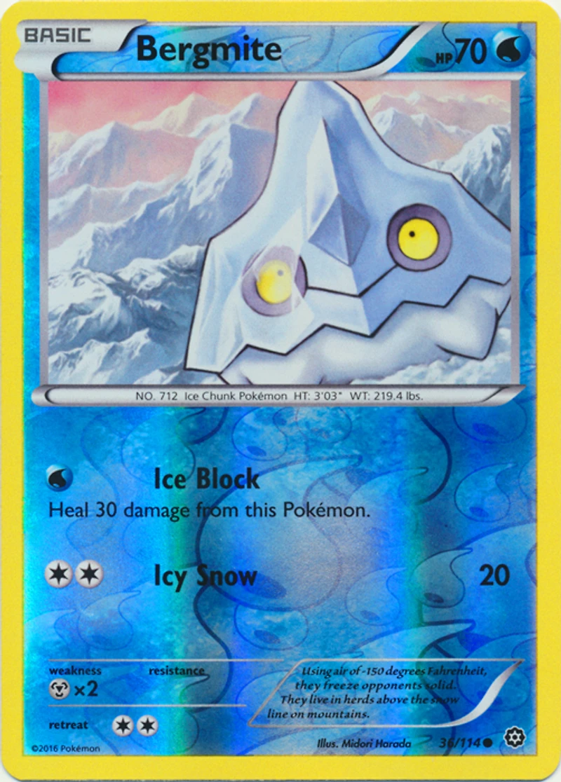 Set: Steam Siege Card Number: 36/114 Rarity: Common Illustrator: Midori Harada Retreat Cost: 2 Weakness: Metal HP: 70 Stage: Basic Card Type: Water Name: Bergmite Finish: Reverse Holo Attack #1: W Ice Block Heal 30 damage from this Pokmon. Attack #2: CC Icy Snow (20) Manufacturer: The Pokemon Company