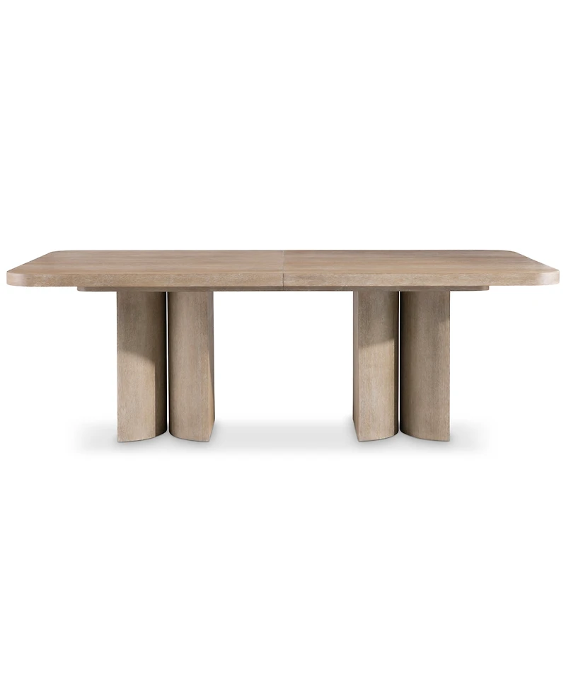 The Loggia dining table places the curved side of architectural pilasters next to each other to form a unique base. They balance a rectangular top with rounded corners for a modern profile. The beautifully textured wood is finished in Aria.